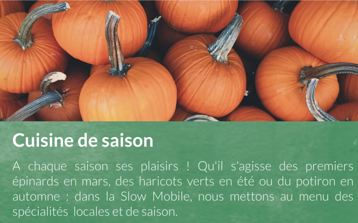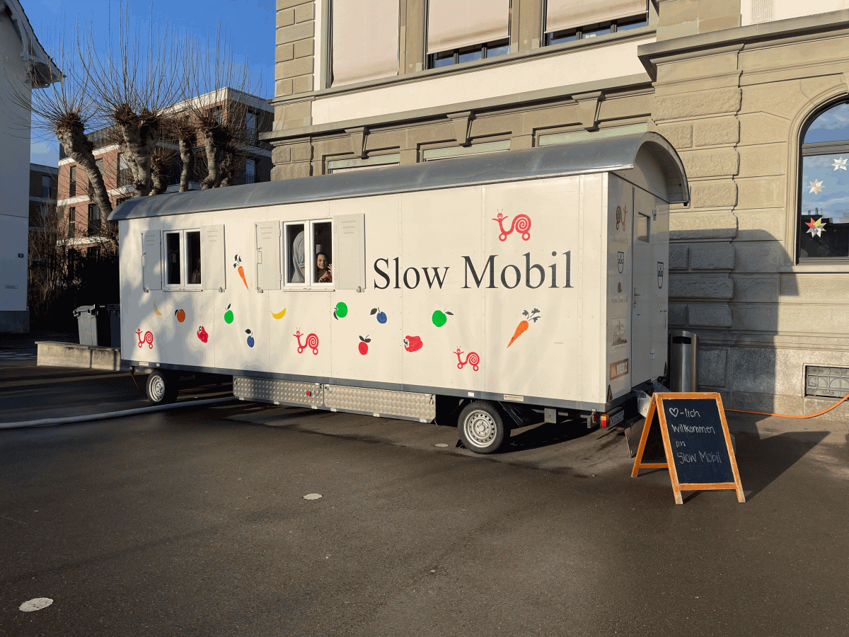 La Slow Mobile vise à sensibiliser les enfants de notre pays et leurs familles, de manière ludique et amusante, à une alimentation saine et durable.Une Slow Mobile est une cuisine pédagogique moderne aménagée dans une roulotte itinérante. Elle se rend dans les jardins d'enfants, écoles, structures parascolaires et fermes de Suisse dans l'objectif de mettre à portée des enfants une alimentation savoureuse et durable de manière tangible.